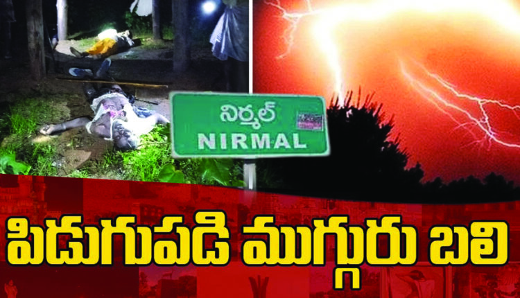 Three killed in lightning strike: పిడుగుపాటుతో ముగ్గురు మృత్యువాత ప‌డ్డారు. నిర్మల్ జిల్లా పెంబి మండలం గుమ్మెఎంగ్లాపూర్ గ్రామంలో రైతులు పొలంలో వ్యవసాయ పనులు చేస్తుండగా ఆకాశం మబ్బులతో కమ్ముకుంది. కొద్దిసేపటికి ఉరుములు, మెరుపులతో గాలివాన మొదలైంది. ఈ క్రమంలో అకస్మాత్తుగా పిడుగు పడి రైతు దంపతులు ఎల్లయ్య, ఎల్లవ్వలతో పాటు రైతు కూలీ వెంకటి అక్కడికక్కడే ప్రాణాలు కోల్పోయారు. విషయం తెలుసుకున్న స్థానికులు అధికారులకు సమాచారం ఇచ్చారు. పోలీసులు సంఘటనా స్థలానికి చేరుకుని మృతదేహాలను పోస్టుమార్టం కోసం తరలించారు. కేసు నమోదు చేసి దర్యాప్తు చేపట్టారు.
