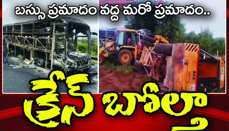 బస్సు ప్రమాదం వద్ద మరో ప్రమాదం.. క్రేన్ బోల్తా