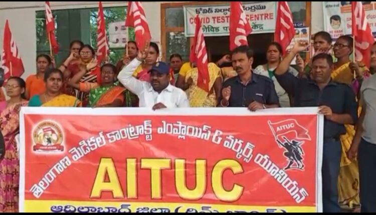 ఆదిలాబాద్ : జిల్లా కేంద్రంలోని రిమ్స్ ఆస్పత్రి కరోనా బ్లాక్ ఎదుట శానిటేషన్ సెక్యూరిటీ గార్డ్స్ పేషెంట్ కేర్ కార్మికులు ఆందోళన నిర్వహించారు. 2 నెలల పెండింగ్ వేతనాలు తక్షణమే చెల్లించాలని, యూనిఫామ్స్,షూస్,గ్లవ్స్ ఇచ్చి కార్మికులను ఆదుకోవాలని నిరసన వ్యక్తం చేశారు. కార్యక్రమానికి ముఖ్య అతిథిగా హాజరైన రాష్ట్ర కార్యదర్శి సిర్ర దేవేందర్ మాట్లాడుతూ పెండింగ్ వేతనాలతో పాటు కార్మికుల సమస్యలు పరిష్కరించాలని జిల్లా కలెక్టర్, రిమ్స్ డైరెక్టర్ కి వినతిప్రతం ఇచ్చామన్నారు. అయినా సమస్యలు పరిష్కరించలేదన్నారు. ఇప్పటికైనా స్పందించి సమస్యలు పరిష్కరించాలని డిమాండ్ చేశారు. స్పార్క్ ఏజెన్సీ గడువు అయిపోయినా ఏజెన్సీ ఎందుకు కొనసాగిస్తున్నారో అర్ధం కావడం లేదని ఆవేదన వ్యక్తం చేశారు. పాత ఏజెన్సీని తొలగించి కొత్త టెండర్ పిలవాలన్నారు. జీవో 21 అమలు చేసి పెరిగిన జీతాలు ఇప్పించాలన్నారు. లేకపోతే ఆదివారం వరకు రోజు ఒక గంట నిరసన ధర్నా, సోమవారం కలెక్టర్ కార్యాలయం ముందు ధర్నా చేస్తామన్నారు. ఆ విధంగా కూడా స్పందించకుంటే సమ్మెకు పోవడానికి కూడా వెనకాడబోమని హెచ్చరించారు. ఈ కార్యక్రమంలో సంఘం జిల్లా అధ్యక్షురాలు కన్నలలక్ష్మీ,కమల,రుక్మిణి,లక్ష్మీ,మంగమ్మ,లస్మమ్మ పాల్గొన్నారు.