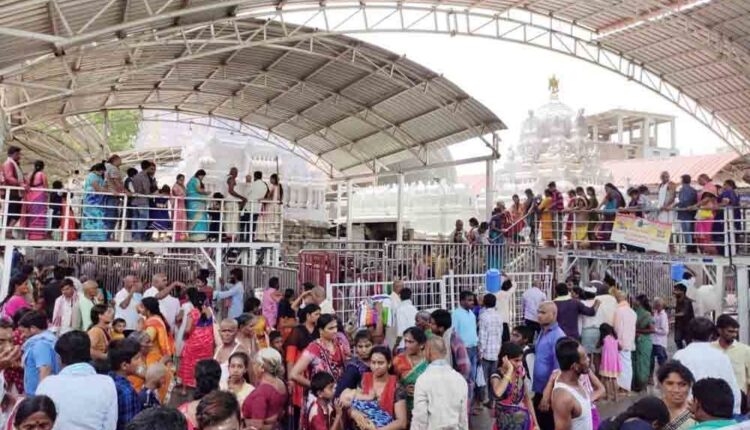 రాజన్న సిరిసిల్ల : రాష్ట్రంలో ప్రముఖ శైవక్షేత్రం వేములవాడ రాజన్న ఆలయానికి భక్తులు పోటెత్తారు. వివిధ ప్రాంతాల నుంచి తరలివచ్చిన భక్తులు తమ ఇష్టదైవమైన రాజరాజేశ్వరస్వామిని దర్శించుకొని తరించారు. స్వామివారి దర్శనానికి తెల్లవారుజాము నుంచే క్యూలైన్లలో బారులు తీరారు. గర్భాలయంలోకి ప్రవేశం నిలిపివేసి లఘుదర్శనం అమలు చేయడంతో భక్తులు నందీశ్వరుడి వద్ద నుంచి స్వామివారిని దర్శించుకున్నారు. పెద్ద సంఖ్యలో భక్తులు స్వామి వారి ప్రీతిపాత్రమైన కోడెమొక్కు చెల్లించుకున్నారు. భక్తులు కల్యాణ కట్టలో తలనీలాలు సమర్పించుకున్నారు. అనుబంధ ఆలయమైన బద్దిపోచమ్మ ఆలయంలోనూ భక్తుల రద్దీ కొనసాగింది. పెద్ద సంఖ్యలో భక్తులు అమ్మవారిని దర్శించుకొని బోనం మొక్కు చెల్లించుకున్నారు.