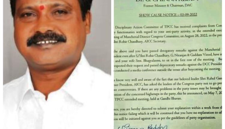 నల్లాల ఓదెలుకు కాంగ్రెస్ అధిష్టానం నోటీసులు జారీ చేసింది. తెలంగాణ ప్రదేశ్ కాంగ్రెస్ కమిటీ క్రమశిక్షణ కమిటీ చైర్మన్ డా.చిన్నారెడ్డి ఓదెలుకు షోకాజు నోటీసు జారీ చేశారు. గత నెల 28న మంచిర్యాలలో ప్రేంసాగర్రావు, జిల్లా కాంగ్రెస్ పార్టీ అధ్యక్షురాలు కొక్కిరాల సురేఖ ఆధ్వర్యంలో పార్టీ సమావేశం జరిగింది. అయితే ఈ సమావేశానికి జడ్పీ చైర్మన్ నల్లాల భాగ్యలక్ష్మి, మాజీ ఎమ్మెల్యే ఓదెలును పిలవలేదు. దీంతో గాంధీభవన్కు ఓదెలు సమాచారం అందించారు. మీరు వెళ్లాలని అక్కడి నుంచి సూచనలు రావడంతో ఆయన సమావేశానికి హాజరయ్యారు.
