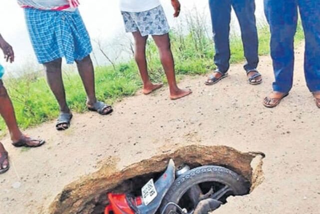 చెరువు కట్ట కుంగి… గోతిలో పడ్డ ద్విచక్రవాహనం