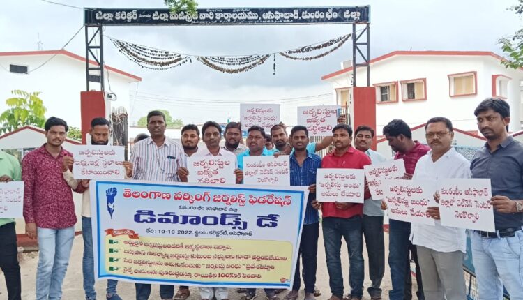 Journalists should be granted houses: జర్నలిస్టులకు ఇళ్ల స్థలాలు ఇల్లు మంజూరు చేయాలని తెలంగాణ వర్కింగ్ జర్నలిస్టు ఫెడరేషన్ జిల్లా అధ్యక్షులు గణపురం మహేష్ డిమాండ్ చేశారు. రాష్ట్ర కమిటీ పిలుపు మేరకు సోమవారం కలెక్టరేట్ కార్యాలయం ఎదుట సంఘం జాతీయ కౌన్సిల్ సభ్యుడు సురేందర్ రావు, ప్రధాన కార్యదర్శి రాజశేఖర్ తో కలిసి నిరసన కార్యక్రమం నిర్వహించారు. అనంతరం జిల్లా కలెక్టర్ రాహుల్ రాజ్ కు వినతిపత్రం అందజేశారు. ఈ సందర్భంగా వారు మాట్లాడుతూ తెలంగాణ రాష్ట్ర ఆవిర్భావం తర్వాత జర్నలిస్టులకు ఇళ్ల సలాలు మంజూరు చేయలేదని ఆవేదన వ్యక్తం చేశారు. దీనివల్ల అనేక మంది పేద జర్నలిస్టులు ఇబ్బంది పడుతున్నారన్నారు. వెంటనే అర్హులైన జర్నలిస్టులకు ఇళ్ల స్థలాలు ఇండ్లు మంజూరు చేయాలని డిమాండ్ చేశారు. ప్రస్తుతం జర్నలిస్టులకు ఇస్తున్న బస్సు పాస్ కూడా పూర్తిస్థాయిలో వర్తించడం లేదన్నారు. రైల్వేపాస్, బస్పాస్ 100 శాతం రాయితీ వర్తించేలా ఉత్తర్వులు జారీ చేయాలని డిమాండ్ చేశారు. జర్నలిస్టు కుటుంబ సభ్యులకు ఆర్టీసీ బస్సు రాయితీ వర్తింపచేయాలన్నారు. జర్నలిస్టులకు “జర్నలిస్ట్ బంద్ పథకం” ప్రవేశపెట్టాలని డిమాండ్ చేశారు. టోల్ గేటు ఫీజ్ నుండి జర్నలిస్టులకు మినహాయింపు ఇవ్వాలన్నారు. రద్దు చేసిన రైల్వే పాసులను కేంద్ర ప్రభుత్వం వెంటనే పునరుద్ధరించాలని డిమాండ్ చేశారు. చిన్న పత్రికలకు అక్రిడేషన్ కార్డులు మంజూరు చేయడంతో పాటు, ప్రభుత్వం ఇస్తున్న వ్యాపార ప్రకటనల్లో ప్రాధాన్యత ఇవ్వాలని కోరారు. ఈ కార్యక్రమంలో సంఘం రాష్ట్ర కౌన్సిల్ సభ్యుడు నీలి సతీష్, ఉపాధ్యక్షుడు ప్రకాష్, ట్రెజరర్ కృష్ణ మోహన్ గౌడ్, సభ్యులు శ్రీకాంత్, అవినాష్, కె. వేణుగోపాల్, విష్ణు గౌడ్, ఎండి ఇసాక్, విష్ణు, లలిత్ కుమార్, శ్రీనివాస్, మీర్జా జలీల్, బాల శ్రీనివాస్, నాగేందర్, బాలాజీ, రవి, రాజేశ్వర్, శ్రీధర్, జానకిరామ్, ఐజేయు నాయకులు అడప సతీష్, బిక్కాజీ తదితరులు పాల్గొన్నారు.