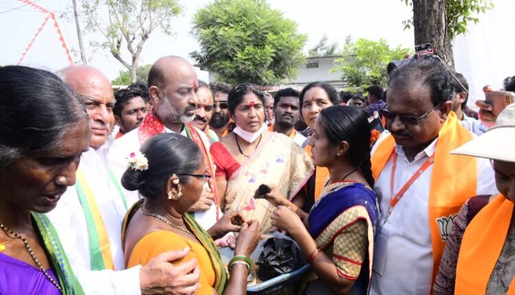 బీజేపీ అధికారంలోకి రాగానే పంట నష్టపోయిన రైతులకు పరిహారం అందించడంతోపాటు రైతు బీమాను కూడా అందజేస్తామని పార్టీ రాష్ట్ర అధ్యక్షులు, ఎంపీ బండి సంజయ్ కుమార్ తెలిపారు. పంట నష్టపరిహారంతో పాటు రైతు బీమా అందని రైతులకు బీజేపీ అండగా ఉంటుందని స్పష్టం చేశారు. శుక్రవారం ఉదయం ప్రజా సంగ్రామ యాత్ర ప్రారంభానికి ముందు నిర్మల్ జిల్లా కుంటాల మండలం అంబకంటి తండాకు చెందిన భర్తను కోల్పోయిన రైతు శ్యాముకాబాయి తన గోడు వెళ్ళబోసుకున్నారు. తన భర్త రాథోడ్ రవీందర్ ఈ ఏడాది జూలై 25న మరణించాడని తెలిపారు. తనకు 2 ఎకరాల పట్టా భూమి ఉన్నా ‘రైతు బంధు’ రావడం లేదని వాపోయారు. పట్టా ఉన్నా ఆన్లైన్లో మాత్రం తమ భూమిని చూపించడం లేదని తెలిపారు. దీంతో భర్త చనిపోయి 5 నెలలు గడిచినా ఇంతవరకు ‘రైతు బీమా’ కూడా అందలేదన్నారు. అకాల వర్షాలతో పంట నష్టపోయినప్పటికీ పరిహారం కూడా అందలేదన్నారు. అధికారులు, ఎమ్మెల్యే చుట్టూ ఎన్నిసార్లు తిరిగినా పట్టించుకున్న పాపాన పోలేదని వాపోయారు. చాలా పేదదాన్ని నేను… నా కుటుంబాన్ని ఆదుకోండి సారూ.. ‘రైతుబంధు’, ‘రైతు బీమా’ వచ్చేలా… మీరే చూడాలి సారూ అని ప్రాథేయపడ్డారు.